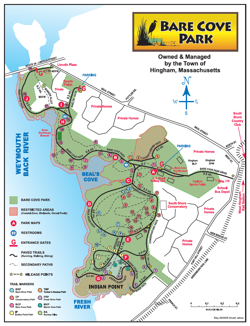 Bare Cove Park's many miles of paved roadways and woodland trails are ideal for walking, jogging, bicycling, or peaceful contemplation.