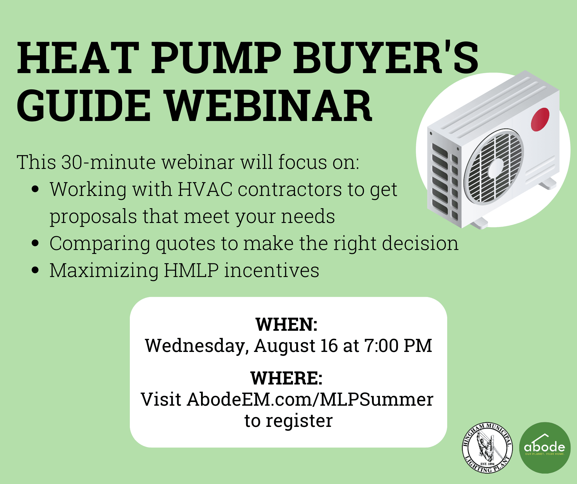 Navigating the heat pump installation process can be difficult to go it alone. Join the Hingham Municipal Light Plant and Abode Energy for a quick, informative webinar aimed at making your heating and cooling journey as straightforward as possible. Register for the webinar here: AbodeEM.com/MLPSummer.