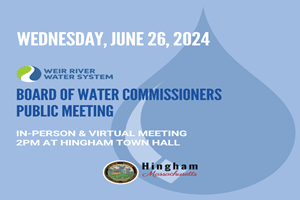 The Weir River Water System Board of Water Commissioners will meet on Wednesday, June 26 at 2PM. Their agenda includes an update on the WRWS water quality and a review of recent events. The meeting is open to the public and will be held at Hingham Town Hall and remotely via Zoom.  For more information, please read the latest WRWS update.