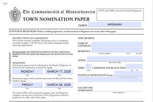 Please call ahead at (781) 741-1410 to schedule an appointment to pick up your nomination papers.  The filing deadline is March 17, 2025.